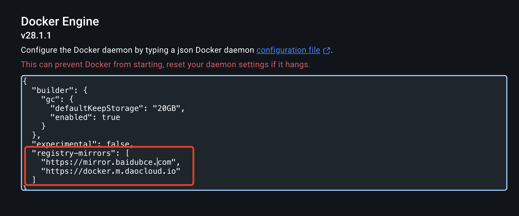解决方案:修改docker的配置文件,将 registry-mirrors 配置项改为:
